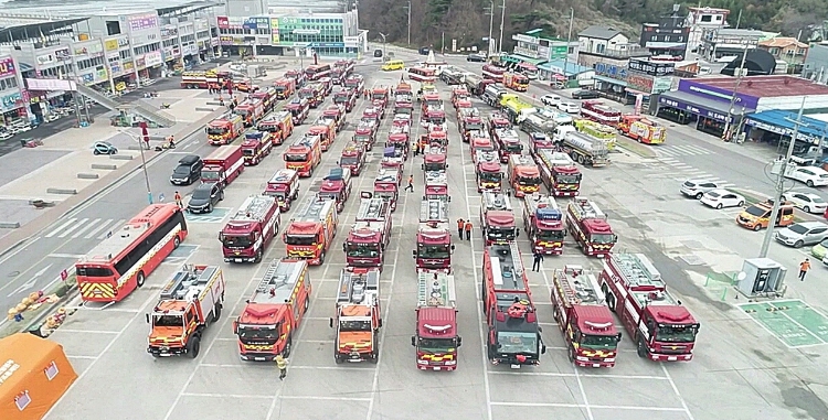 | ▲ 23년 홍성 산불 진화를 위해 소방차량들이 남당항 주차장에모여있는 모습 |