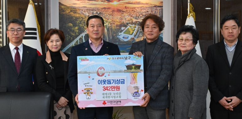 [뉴스노크=김인호 기자] 대구 남구는 대명3동 뉴타운 재개발사업 조합의 조합장(이대룡)을 비롯한 임원, 대의원 및 직원이 지난 2025년 12월 30일 연말을 맞아 어려운 이웃을 위해 써달라며 정성껏 모은 성금 342만원을 기탁했다고 밝혔다.