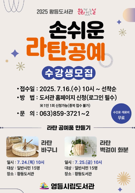익산시는 황등도서관에서 오는 24일과 25일 '손쉬운 라탄공예' 프로그램을 운영한다고 15일 밝혔다.