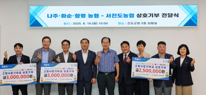 [뉴스노크=김인호 기자] 진도군은 지난 8월 19일 진도군청에서 서진도농협, 나주시 영산포농협, 화순군 이양청풍농협, 함평군 손불농협과 손을 맞잡고 고향사랑기부제 상호 기부금 전달식을 개최했다고 밝혔다.