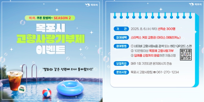 [뉴스노크=김인호 기자] 목포시는 고향사랑기부제에 대한 기부자들의 높은 관심과 적극적인 참여에 힘입어, ‘아·아 쿠폰왔썸머~ 고향사랑기부 참여 이벤트 시즌2’를 새롭게 추진한다고 밝혔다.