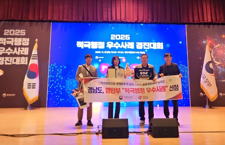 [뉴스노크=김인호 기자] 경남도가 지난 27일 열린 행정안전부 ‘2025년 적극행정 우수사례 경진대회’에서 ‘적극행정으로 국제중재 첫 승소, 138억 절감 도민에게 돌려줘’ 사례로 기관 표창(인사혁신처장상)을 받았다고 28일 밝혔다.