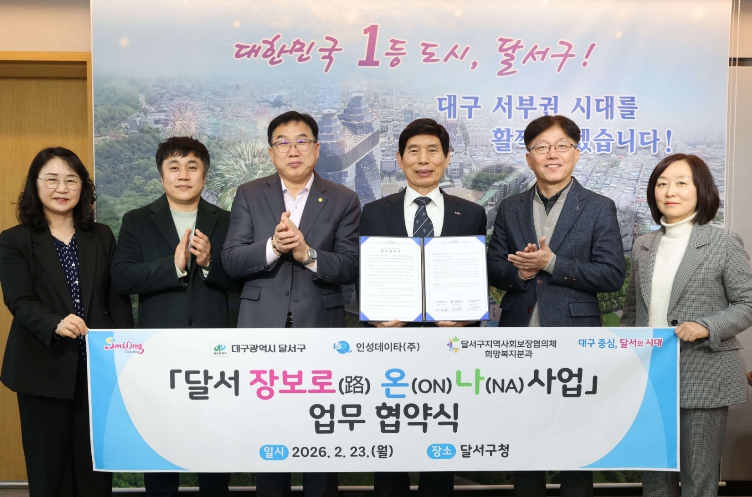 [뉴스노크=김인호 기자] 대구 달서구는 23일 인성데이타(주)(대표 최현환), 달서구지역사회보장협의체 희망복지분과(분과장 최안집)와 함께 거동이 불편한 중장년 1인 장애인 세대 등을 대상으로 온라인 장보기 지원을 위한 업무협약을 체결했다.