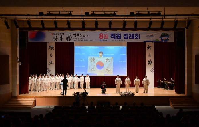 ▲ 제80주년 광복절을 앞두고 지난 6일, 8월 직원 정례회 식전 공연으로 뮤지컬 ‘코레아 우라(대한민국 만세)’를 선보이며 순국선열과 애국지사의 숭고한 희생정신을 되새기는 뜻깊은 시간을 마련했다. |