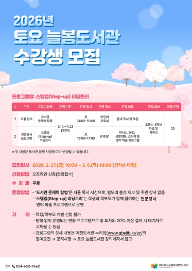 [뉴스노크=김인호 기자] 경상북도교육청 예천도서관은 지역 어린이들의 문해력 향상과 영어 학습 역량 강화를 지원하기 위해 2026년 토요 늘봄도서관 수강생을 모집한다.