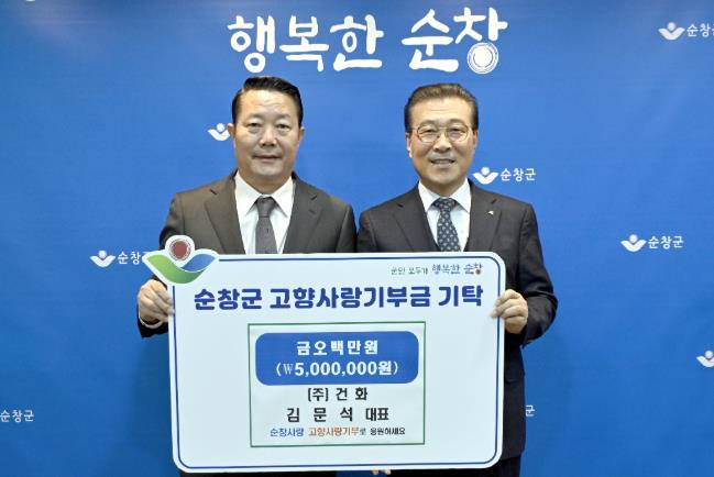 [뉴스노크=김인호 기자] 순창군은 15일 ㈜건화 김문석 대표이사가 순창군에 고향사랑기부금 500만원을 기탁했다고 밝혔다.