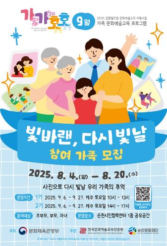 [뉴스노크=김인호 기자] (재)순천문화재단은 오는 20일까지 2025 생활밀착형 문화예술교육지원사업의 일환으로 '가가호호(家加好好)'의 네 번째 프로그램인 ‘빛바랜, 다시 빛날’ 프로그램 참여 가족을 모집한다고 밝혔다.