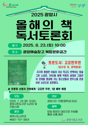 이번 토론회에는 광양시립도서관에 등록된 독서동아리 회원들도 함께 참여해 책을 매개로 더 깊이 있는 의견을 나눌 예정이다. 시는 토론이 처음인 시민들도 부담 없이 참여할 수 있도록 비경쟁 방식으로 진행하며, 사전에 참가자 전원에게 도서를 배부해 자율적이고 적극적인 참여를 유도할 계획이다.