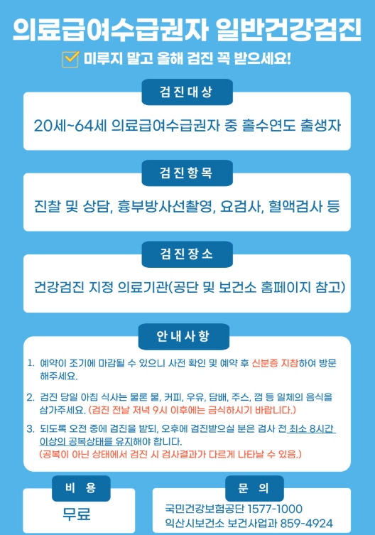 건강검진은 국민건강보험공단에서 지정한 병·의원에서 무료로 받을 수 있으며, 검진 기관은 국민건강보험공단 누리집 또는 익산시보건소 누리집에서 확인할 수 있다.