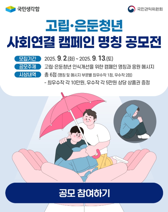 이번 공모전은 고립·은둔청년에 대한 사회적 편견을 해소하고 그들에게 용기와 희망을 주기 위해 마련됐다. 공모 기간은 9월 2일부터 9월 13일까지이며, 국민권익위가 운영하는 정책소통 플랫폼인 국민생각함을 통해 국민 누구나 참여할 수 있다.