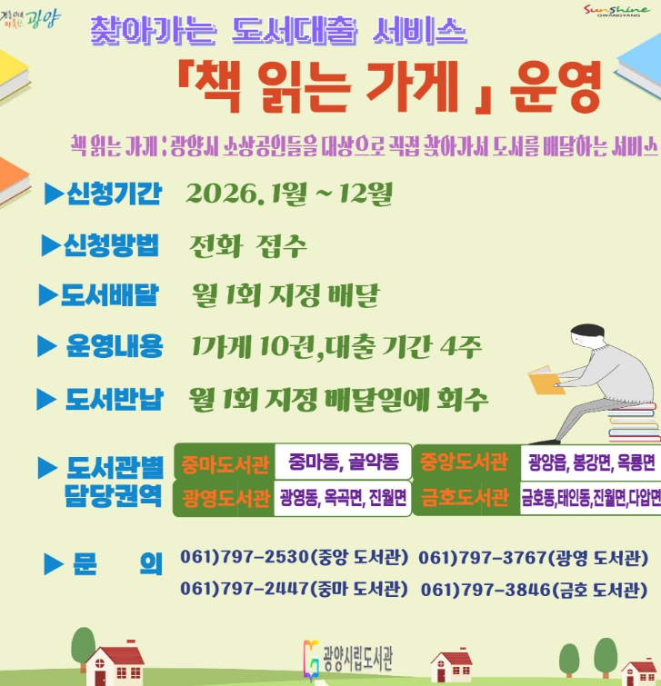 [뉴스노크=김인호 기자] 광양시립도서관은 지역사회 독서문화 확산을 위해 도서관 방문이 어려운 지역 내 소상공인을 대상으로 2026년 ‘책 읽는 가게’ 사업을 운영한다.