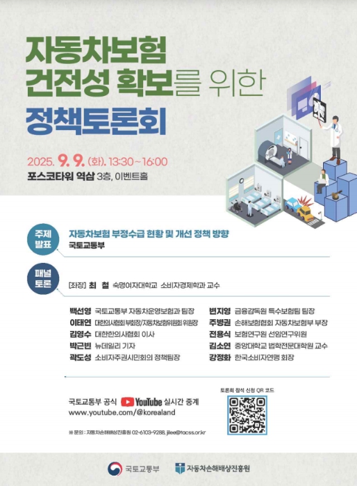 이번 정책토론회는 자동차보험 제도에 대한 국민의 의견을 직접듣기 위해 마련된 자리로, 현장에는 200명의 방청객을 초대하고, 유튜브로도 생중계할 예정이다.