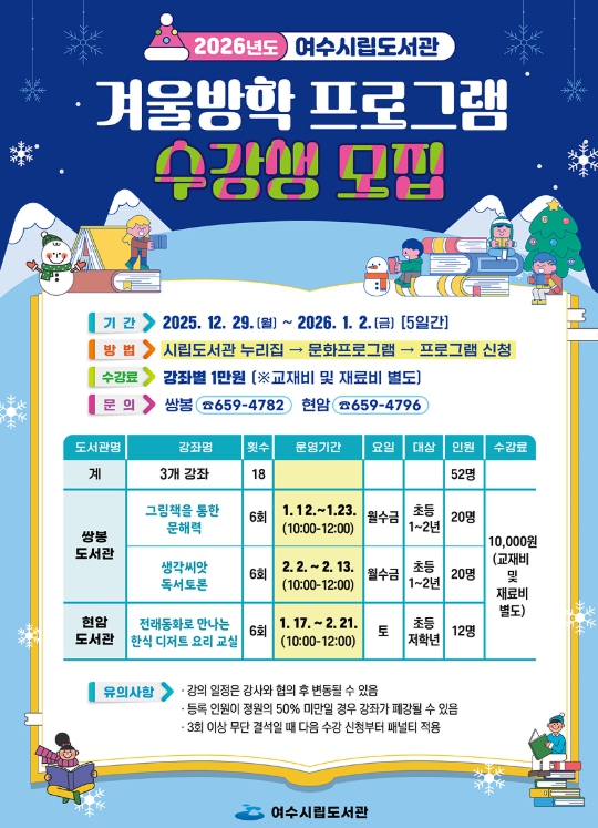 [뉴스노크=김인호 기자] 여수시립도서관은 오는 12월 29일부터 2026년 1월 2일까지 5일간 관내 초등학생을 대상으로 2026년 겨울방학 프로그램 수강생 52명을 선착순 모집한다.