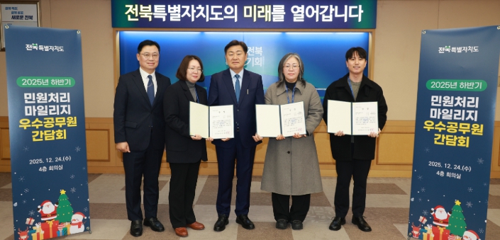 [뉴스노크=김인호 기자] 전북특별자치도가 24일 '2025년 하반기 민원 처리 우수직원 시상 및 간담회'를 개최하고, 신속하고 성실한 민원 업무 수행으로 높은 평가를 받은 직원들을 격려했다.