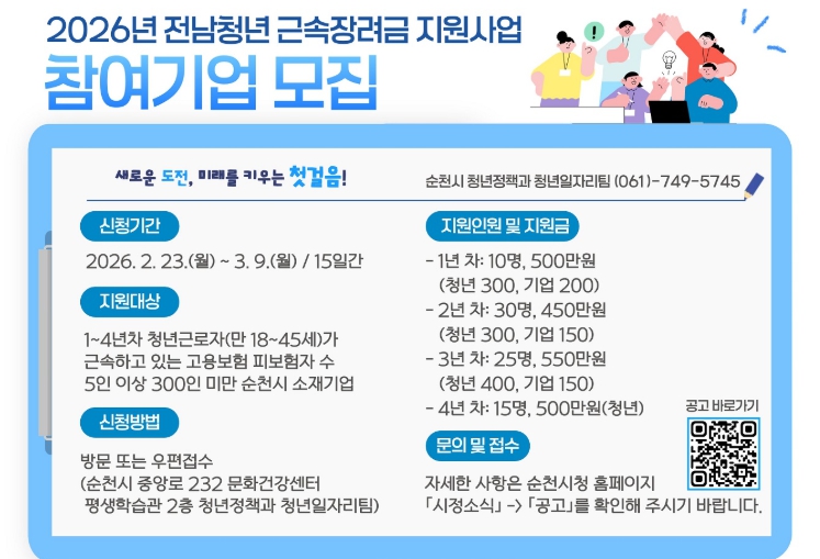 [뉴스노크=김인호 기자] 순천시는 지역 청년들의 정규직 취업 촉진 및 장기근속을 유도하기 위해 2026년 전남 청년 근속장려금 지원사업 참여 기업을 모집한다고 밝혔다.