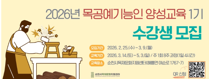 [뉴스노크=김인호 기자] 순천시는 시민들의 목공 체험 기회를 확대하고 목재문화 활성화를 위해 ‘2026년 목공예기능인 양성교육 1기’ 수강생을 오는 3월 9일까지 모집한다고 밝혔다.