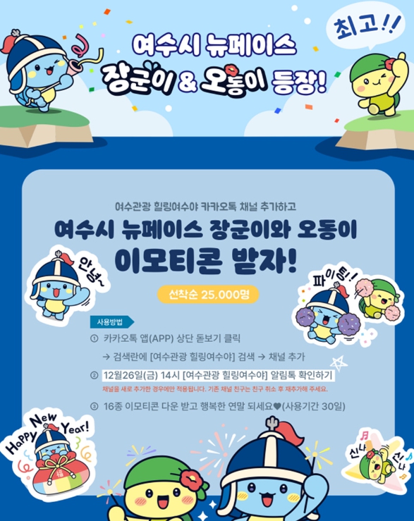 [뉴스노크=김인호 기자] 여수시가 새롭게 리뉴얼된 마스코트 ‘장군이·오동이’ 카카오톡 이모티콘을 오는 26일 오후 2시부터 선착순 2만 5천 명에게 무료로 배포한다고 밝혔다.