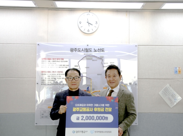 [뉴스노크=김인호 기자] 광주교통공사가 최근 광주시 서구 마륵동 본사에서 (사)한국 백혈병소아암협회 광주전남지회에 임직원들이 정성으로 모은 성금 200만 원을 전달하며 환아들의 따뜻한 연말연시를 기원했다.