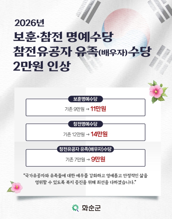 [뉴스노크=김인호 기자] 화순군은 2026년 1월부터 국가보훈대상자와 유족에 대한 예우를 한층 강화하기 위해 보훈 관련 수당을 월 2만 원씩 인상한다고 밝혔다.