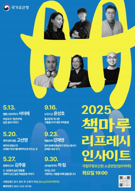 [뉴스노크=김인호 기자] 국가유산청은 9월 16일과 23일, 30일 오후 7시에 총 3회에 걸쳐 국립무형유산원 소공연장(전북 전주시)에서 '2025 하반기 ‘무형유산 책마루’ 인문학 강연'을 개최한다.