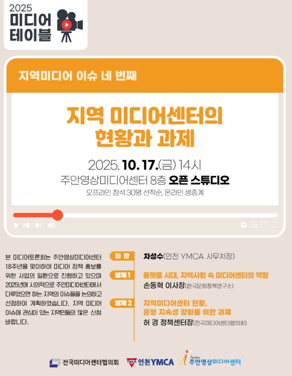 [뉴스노크=김인호 기자] 인천 미추홀구 주안영상미디어센터는 오는 10월 17일 오후 2시 센터 오픈 스튜디오에서 ‘미디어 테이블: 지역 미디어센터의 현황과 과제’ 토론회를 개최한다.