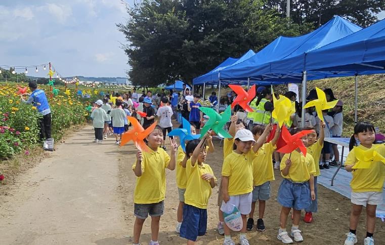 또한 바람개비 만들기 체험을 통해 본인의 이름이 적힌 바람개비를 만들어 백일홍 꽃밭에 설치하는 시간도 가졌는데 마침 날씨 또한 바람이 불어 아름다운 꽃밭에 바람개비가 힘차게 돌아가는 장관을 연출하기도 했다.