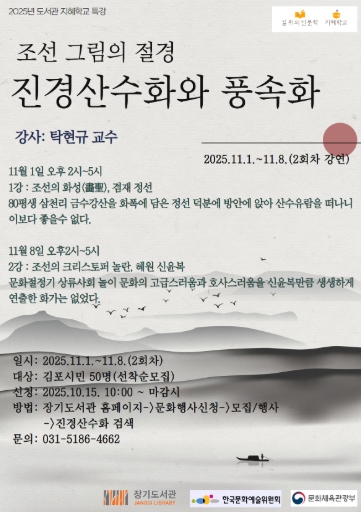 [뉴스노크=김인호 기자] 김포시 장기도서관은 2025년 도서관 지혜학교 특강으로 '조선 그림의 절경 진경산수화와 풍속화'를 오는 11월 1일, 11월 8일 오후 2시부터 5시까지 장기도서관 대강당에서 운영한다고 밝혔다
