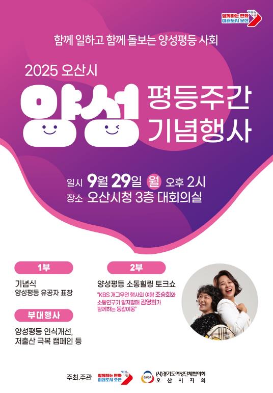 [뉴스노크=김인호 기자] 오산시는 오는 9월 29일 오후 2시, 오산시청 3층 대회의실에서 ‘2025년 양성평등주간 기념행사’를 개최한다고 밝혔다. 이번 행사는 “모두가 존중받는 성평등 사회, 모두가 행복한 오산”을 주제로 양성평등의 의미를 되새기고 시민이 함께 소통하며 즐길 수 있는 프로그램으로 진행된다.