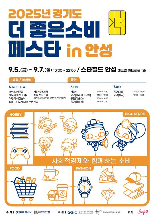[뉴스노크=김인호 기자] 안성시가 오는 9월 5일부터 9월 7일까지 3일간 오전 10시부터 오후 10시까지 스타필드 안성 센트럴 아트리움 1층에서 ‘2025 안성시 더 좋은소비 페스타’를 개최한다.