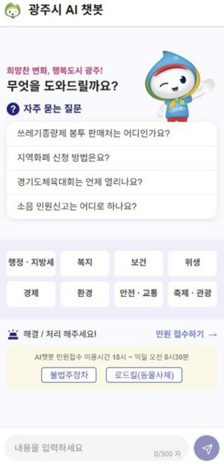 ‘AI 민원 채팅 로봇’은 광주시 대표 홈페이지에 탑재돼 시민의 질문을 이해하고 담당 부서를 자동 분류해 채팅 방식으로 답변을 제공한다. 불법주정차 단속, 동물 사체 처리 등 접수 빈도가 높은 민원은 신고부터 담당 부서 전달까지 절차를 자동화해 신속한 처리가 가능하도록 했다. ‘AI 민원 콜봇’은 음성 통화 기반 서비스로 야간 및 당직 시간(18:00~다음 날 08:30) 동안 AI 상담사가 민원 전화를 받아 응대한다. 자주 묻는 질문과 민원 편람을 학습했으며 불법주정차 및 동물 사체 처리 신고도 전화로 접수·전달한다.