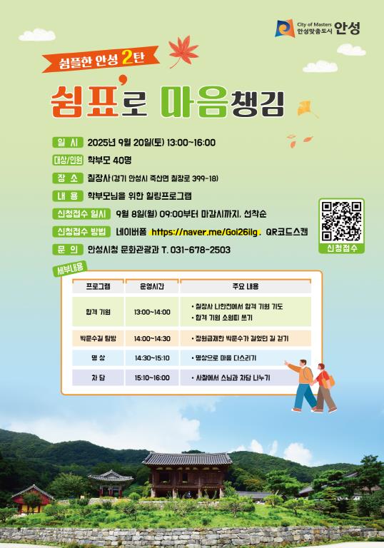 [뉴스노크=김인호 기자] 안성시는 오는 9월 20일 오후 1시부터 4시까지 죽산면 칠장사 일원에서 학부모를 위한 힐링 프로그램 '쉼플한 안성 2탄, 쉼표로 마음챙김'을 운영한다. 이번 행사는 입시를 앞둔 자녀가 있는 학부모들에게 가을 정취 속에서 잠시 멈춤의 시간을 제공하고, 자녀의 건강과 학업 성취를 기원할 수 있도록 마련됐다.