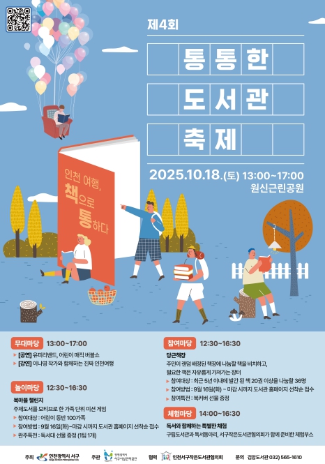 [뉴스노크=김인호 기자] 인천 서구 구립도서관(검암·단봉늘봄·검단·심곡·석남·신석 도서관)이 오는 18일 원신근린공원에서 ‘제4회 통통한 도서관 축제’를 개최한다.