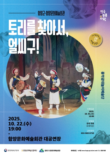 [뉴스노크=김인호 기자] 함양군문화예술회관은 풍악광대놀이“토리를 찾아서, 얼씨구!”공연이 10월 22일 오후 7시 함양문화예술회관 대공연장에서 개최한다고 밝혔다.