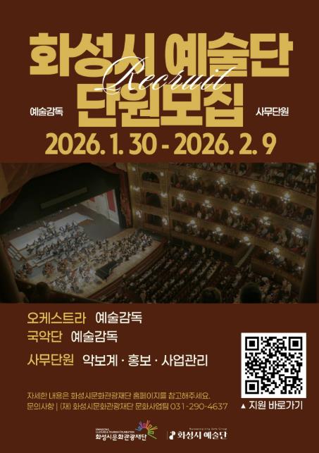 [뉴스노크=김인호 기자] (재)화성시문화관광재단은 2026년 ‘화성시 예술단’을 이끌어갈 예술감독과 사무단원을 모집한다.