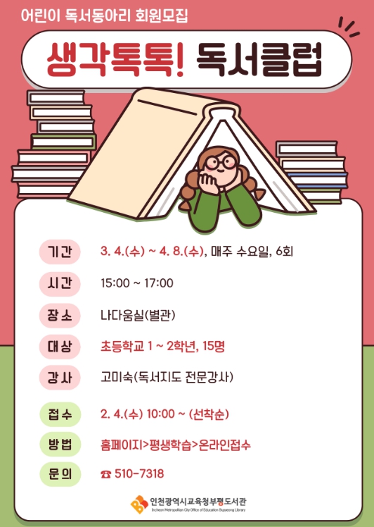 [뉴스노크=김인호 기자] 인천광역시교육청부평도서관은 3월 4일부터 4월 8일까지 2026년 상반기 어린이 독서동아리 ‘생각 톡톡! 독서클럽’을 운영한다.