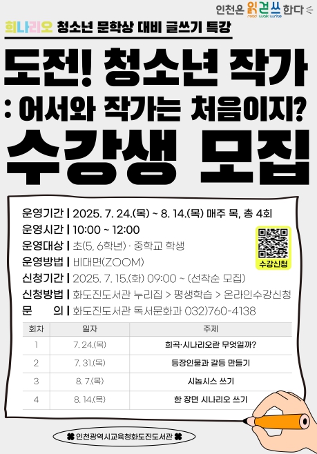 ‘희나리오 청소년 문학상’은 인천시교육청이 올해 처음 신설한 문학 공모전으로, 청소년 창작 경험 확대와 예비 작가 양성을 목표로 한다.
