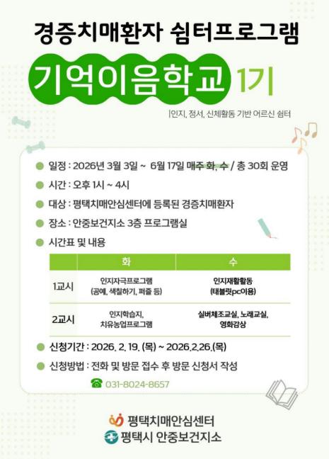 [뉴스노크=김인호 기자] 평택시 안중보건지소는 경증 치매 환자의 인지기능 유지와 일상생활 지원을 위해 오는 3월 3일부터 6월 17일까지 경증 치매 환자 쉼터 프로그램 ‘기억이음학교 1기’를 운영한다.