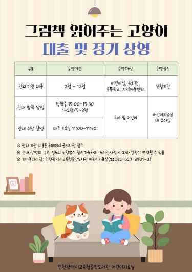 [뉴스노크=김인호 기자] 인천광역시교육청중앙도서관은 그림책 스트리밍 서비스'그림책 읽어주는 고양이'를 2월부터 관내 희망 기관에 대출한다