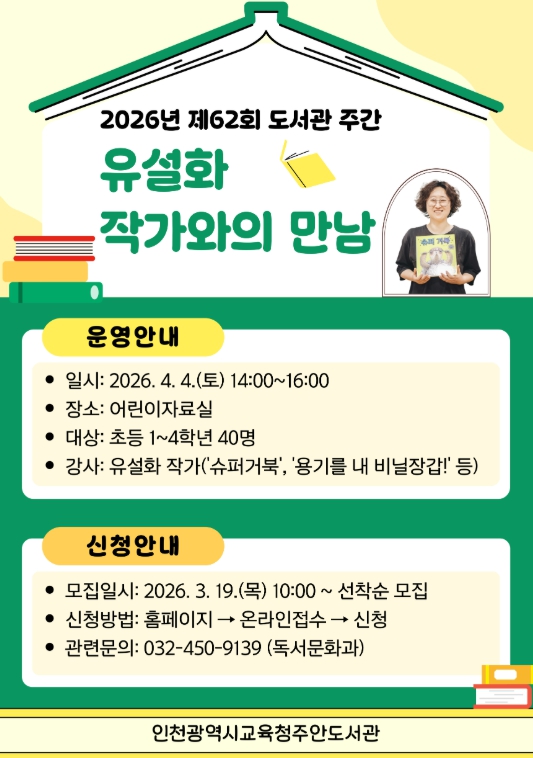 [뉴스노크=김인호 기자] 인천광역시교육청주안도서관은 어린이가 작가와 소통하며 그림책을 깊이 이해하고 독서의 즐거움을 느낄 수 있도록, 오는 4월 4일부터 초등 1~4학년 학생을 대상으로 ‘유설화 작가와의 만남’을 개최한다.