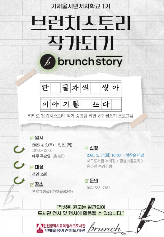 [뉴스노크=김인호 기자] 인천광역시교육청서구도서관은 17일부터, 예비 작가들의 꿈을 지원하기 위한 시민저자학교 1기 ‘브런치스토리 작가되기’ 프로그램 참여자를 모집한다.