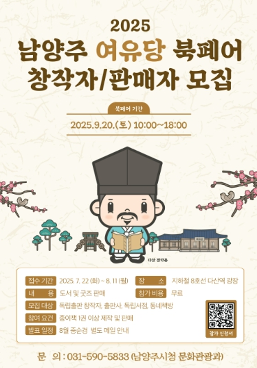 [뉴스노크=김인호 기자] 남양주시는 9월 20일 다산역 광장에서 열리는 ‘2025 남양주 여유당 북페어’에 참가할 창작자와 판매자를 7월 22일부터 8월 11일까지 모집한다.