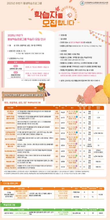 [뉴스노크=김인호 기자] 인천광역시교육청신트리도서관은 오는 8월 13일부터 2025년 하반기 평생학습프로그램 수강생을 모집한다.