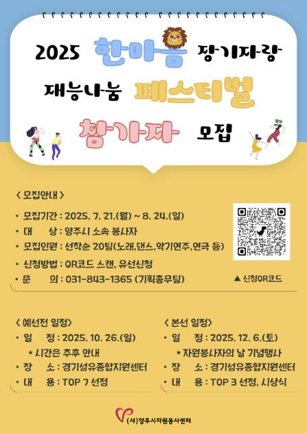 [뉴스노크=김인호 기자] 양주시자원봉사센터는 자원봉사자들의 숨은 끼와 재능을 발휘할 수 있는 ‘2025 한마음 장기자랑 재능나눔 페스티벌’ 참가자를 모집한다고 밝혔다.