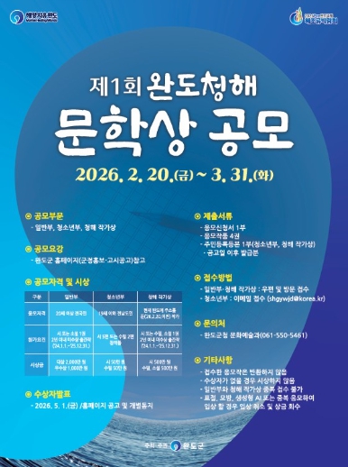 [뉴스노크=김인호 기자] ‘치유의 섬’ 완도군에서는 많은 사람들이 문학의 향기로 마음을 치유할 수 있도록 ‘제1회 완도 청해 문학상’ 공모전을 연다.