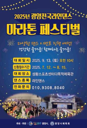 [뉴스노크=김인호 기자] 광양시는 오는 9월 13일 성황스포츠센터에서 ‘2025 광양전국라인댄스 마라톤 페스티벌’을 개최한다고 밝혔다.