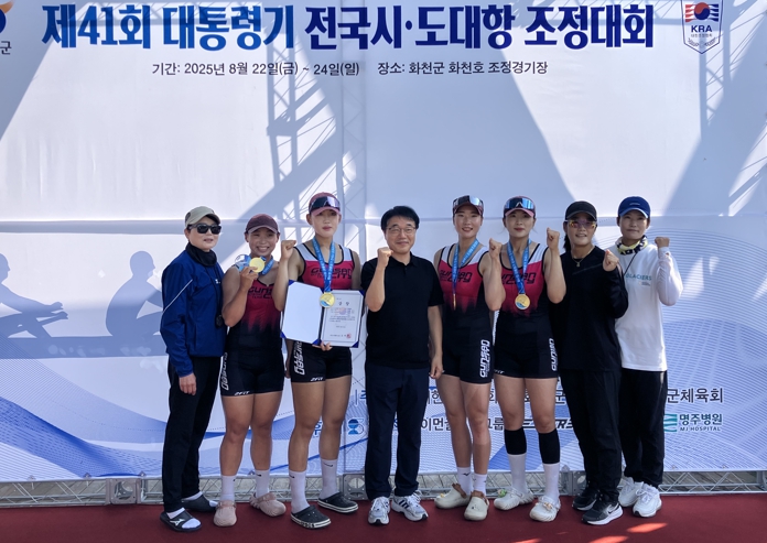 유은경 감독이 이끄는 군산시청 조정팀은 지난 22일부터 24일까지 강원도 화천군 화천호 조정경기장에서 열린 ‘제41회 대통령기 전국시·도대항조정대회’ 여대 및 일반부 쿼드러플스컬과 싱글스컬에 출전해 금메달을 획득했다.