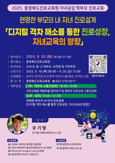 [뉴스노크=김인호 기자] 충청북도교육청 직속기관 진로교육원은 오는 30일 18시에 학부모들이 변화하는 미래사회에 맞춰 자녀의 진로설계 역량을 강화할 수 있도록 2025 하반기 학부모 진로교육을 운영한다고 밝혔다.