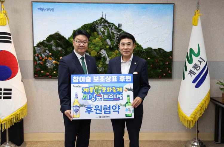 재단은 지난 28일 계룡시청에서 이응우 이사장과 하이트진로(주) 이민복 충청·강원권역장, 홍봉희 특판대전지점장 등이 참석한 가운데 2025계룡軍문화축제 후원 보조 상표 전달식을 가졌다.