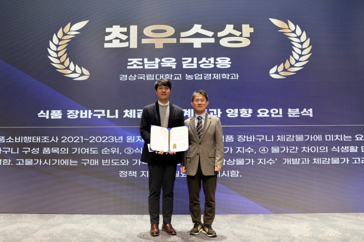 [뉴스노크=김인호 기자] 경상국립대학교(GNU·총장 권진회) 농업경제학과 박사과정 조남욱 씨가 12월 12일 서울 양재aT센터에서 열린 ‘2025 식품소비행태조사 활용 우수논문 경진대회’에서 ‘최우수논문상’(지도교수 김성용)을 수상했다.