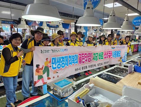 ▲ 지난 21일 여수수산시장, 건어물상가 일대에서 자생단체, 상인회와 함께 ‘민생회복 소비쿠폰 조기 사용’ 캠페인을 실시했다. |